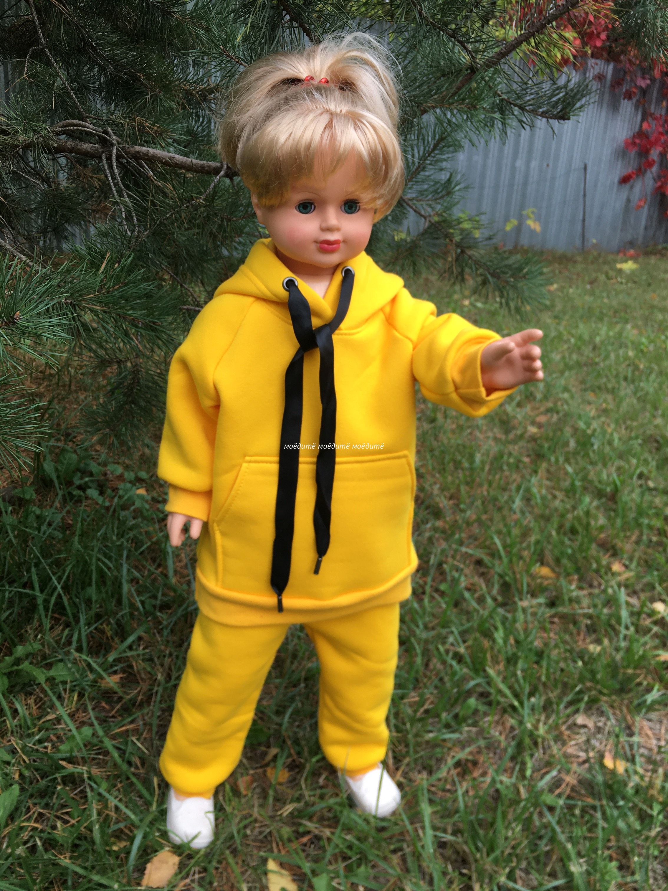 Костюм выполнен из футера трёхнитки с начёсом. Костюм состоит из толстовки с капюшоном, спереди с карманом "кенгуру", на рукавах манжеты. В комплект входят брюки сверху на широкой резинки, снизу на манжетах. И толстовка и брюки декорированы шнурком.